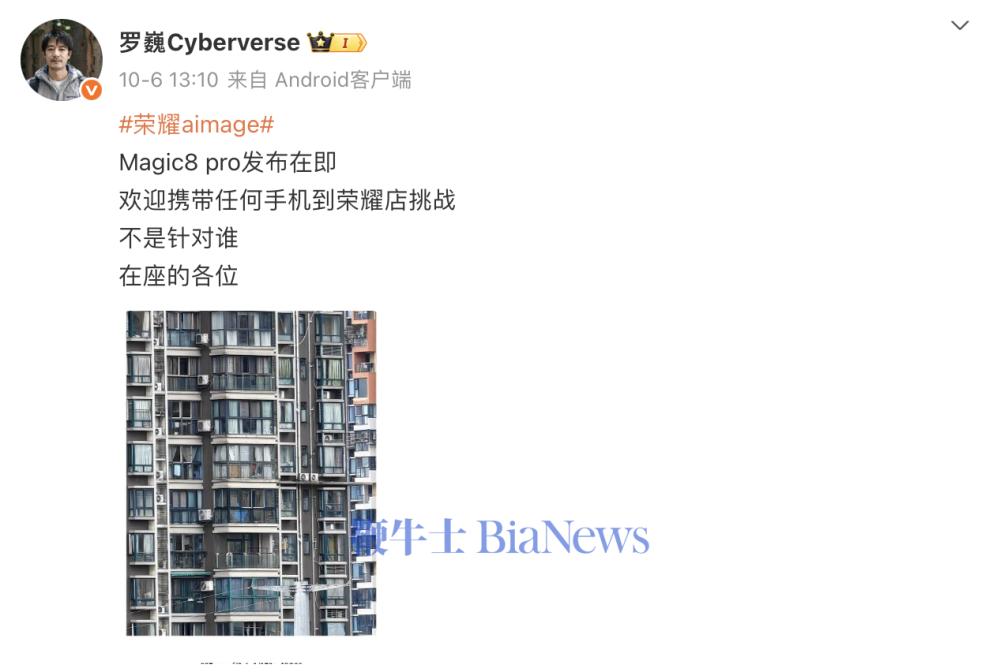 此外,罗巍曾发文表示,“欢迎携带任何手机到荣耀店挑战Magic8系列,不是针对谁,在座的各位。”