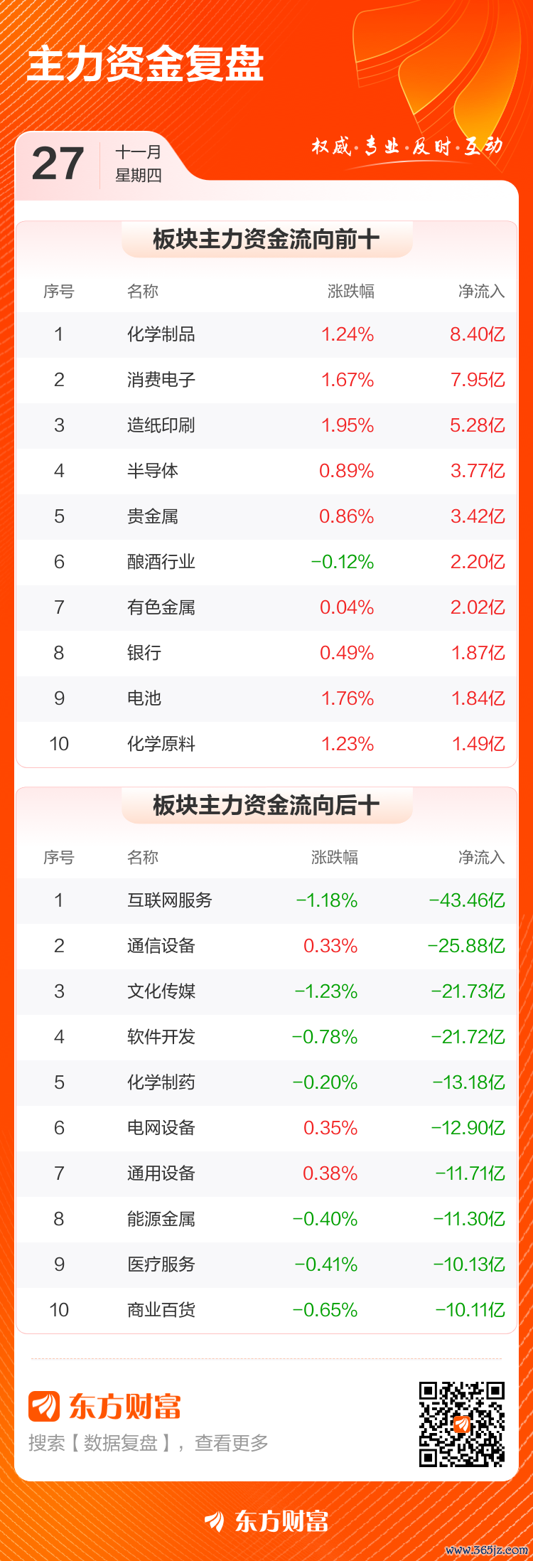 11月27日,沪指涨0.29%,深成指跌0.25%,创业板指跌0.44%。两市成交额1.71万亿,较上个交易日缩量736亿。数据显示,今日大盘主力资金净流出273.46亿。化学制品、消费电子、造纸印刷等板块主力资金流入排名居前旺发速配,其中化学制品净流入8.40亿元。